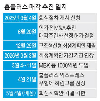 홈플러스 회생 작업은 지난해 3월 4일 홈플러스가 회생절차 개시를 신청하면서 시작됐다. 매각 주관사를 맡은 삼일회계법인은 같은 해 6월 말 홈플러스 회생계획 인가 전 인수·합병(M&A)을 통한 통매각을 추진했다.